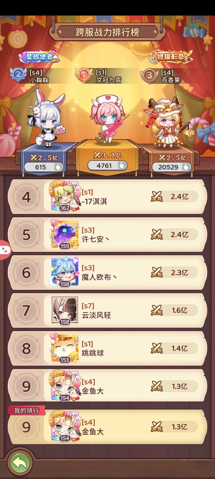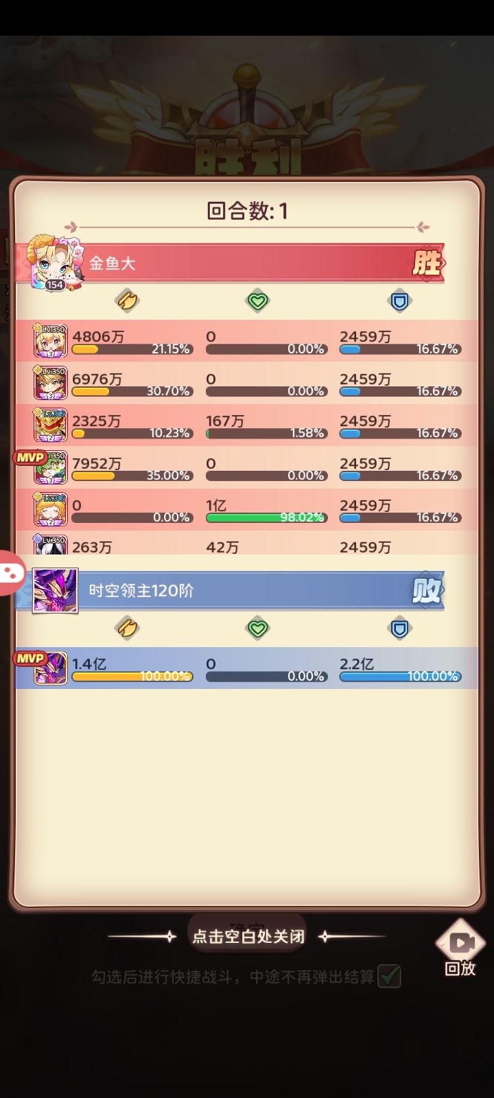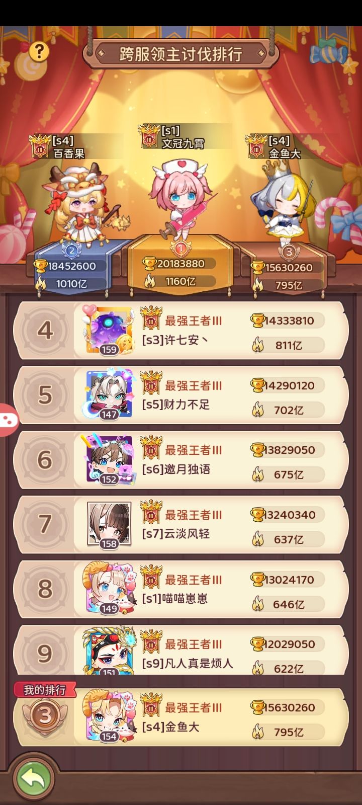 这赛季普遍有点忙,只单独发了第一周的总结(因为暗改boss数值需要重点拎出来)。除开第一周第五外,后面都是第三。只比不过文冠和百香果这两个大氪佬。、 第二三四周的图我就留着不放了,只放最后一天的。 也是在最后一天成功打通时空领主(1.3e战力)。看图可以发现主c是林风和榴莲。可能是目前唯一一个1.5e战力以下不用光暗主c(帝皇,巧克力)打通时空的。极致排轴,极致利用好手里配置。最后120阶是真
