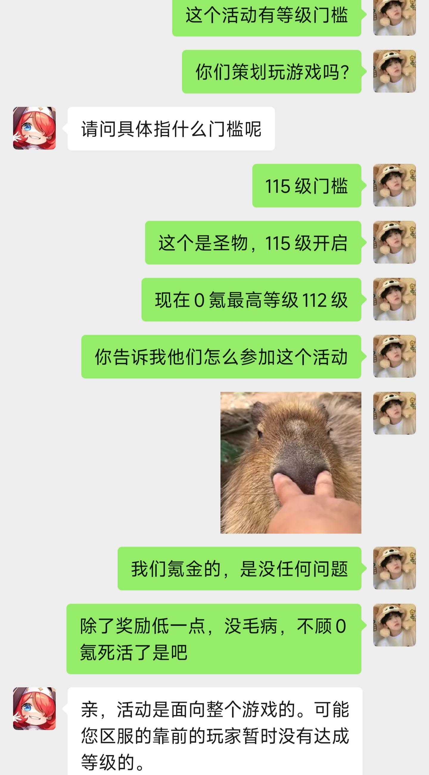 很多人说这玩意0氪参加不了。你哪怕氪了几十元追到115又有什么用?红圣物33点数每分钟,橙紫全是个位数的点数。你刚115甚至117进去,和没进去有区别嘛?哪怕,哪怕你总共10点数每分钟好了,7天10080分钟,最多10万pt,换10抽圣物?所以说这活动至少得等大部队追到120级,最快的低氪有123级以上才好开放。运营现在这样放,明显没把0氪当人。当然,现在的补救方案是肯定没法动活动了,你得发
