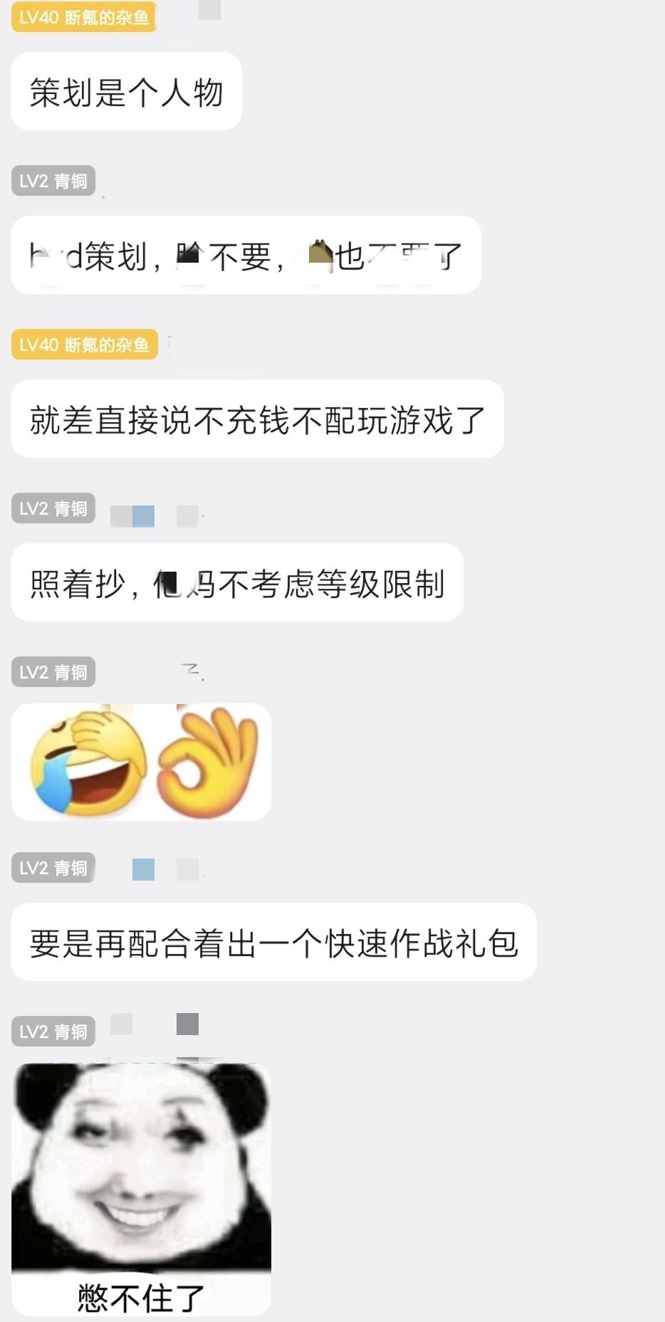 一、建议给那些等级不够的,每隔一个小时就弹一次快速作战礼包二、再把那些没充过钱的直接筛选出来,禁止参加此类活动,活动期间每天必须充值,不然一样禁止参加活动三、反馈问题的一律装作看不见,只需要回复问题已提交正在优化就行四、直接发个公告,我们游戏不缺你一个,你爱玩不玩,最后再补偿10万金币就行😁(希望策划越来越好,⭕钱越来越多)