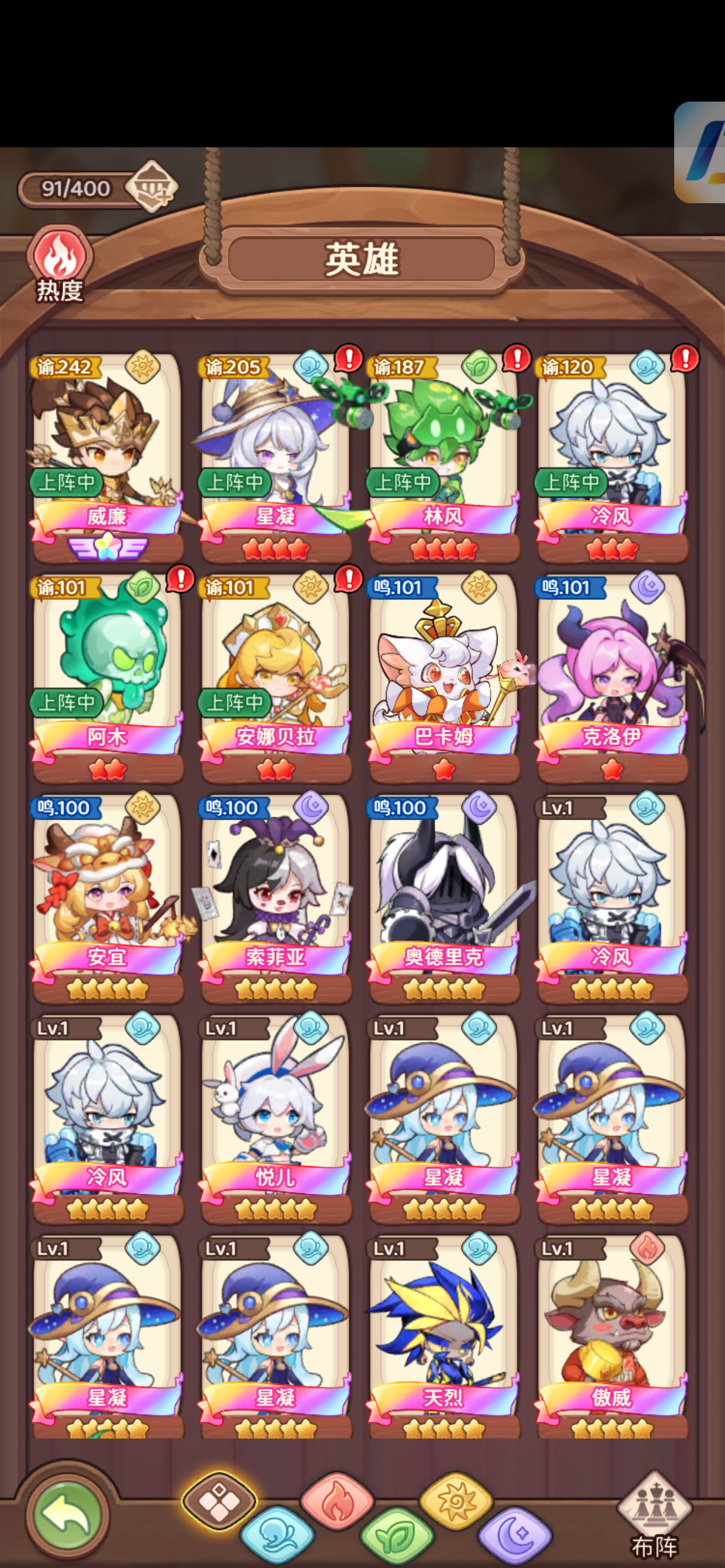 距离上次发帖,刚刚两周,也是来交作业了:奶糖十三星16觉,黑森林十二星15觉,巧克力十二星五觉+魔导器10。虽然战力没什么大的提升,但是屯屯鼠的快乐,就是这心里期望达到的瞬间的快乐。下一步,奶糖20觉,榴莲十二(为了借13的英雄),黑森林十三。下次见~