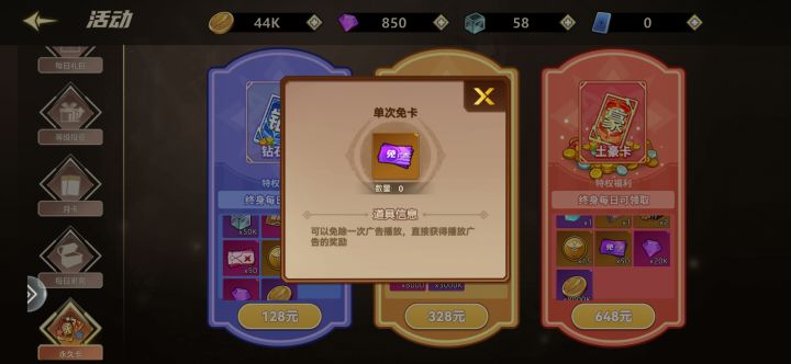 如图,648送50张免广券,免费的福利都是看广告才能获得,半屏充值活动,氪佬欢迎, 还有自动战斗是要买另外的月卡,跟如图又不一样,战力充就有,不充白嫖那点资源你刷图都难 tap评分10分证明游戏优秀