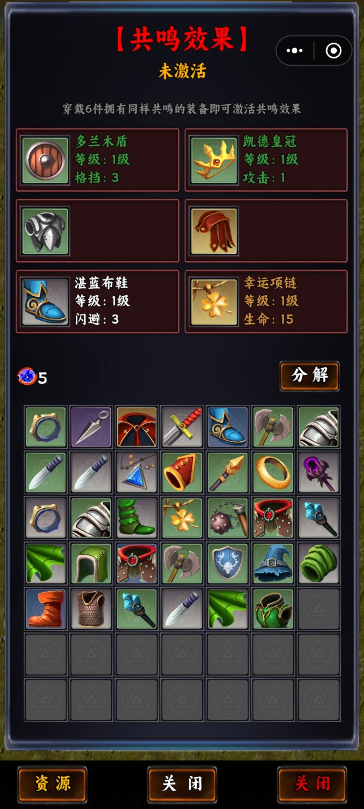 4、打开装备界面后,下方UI两个关闭按钮,有一个应该是返回,按钮文本需修正。