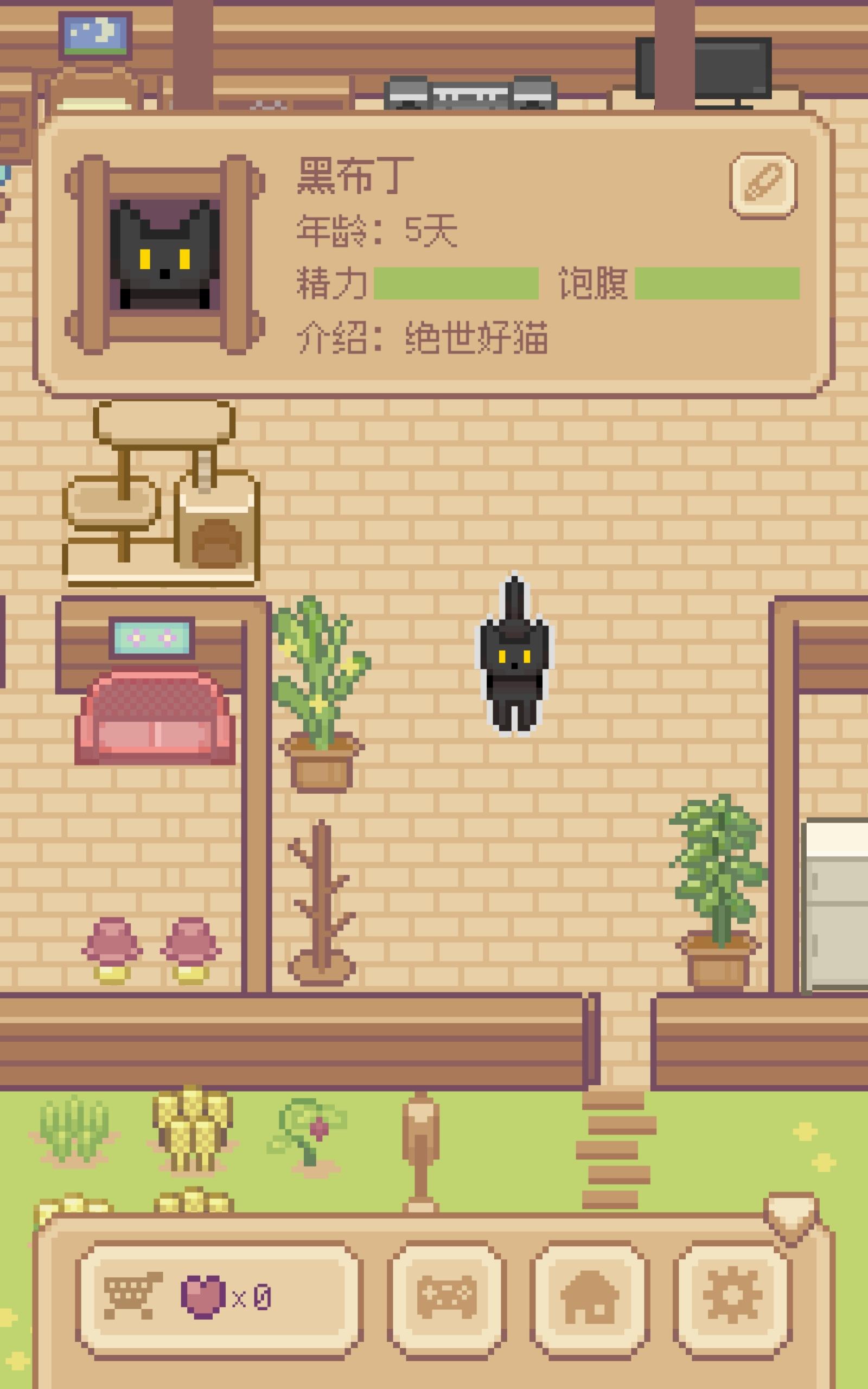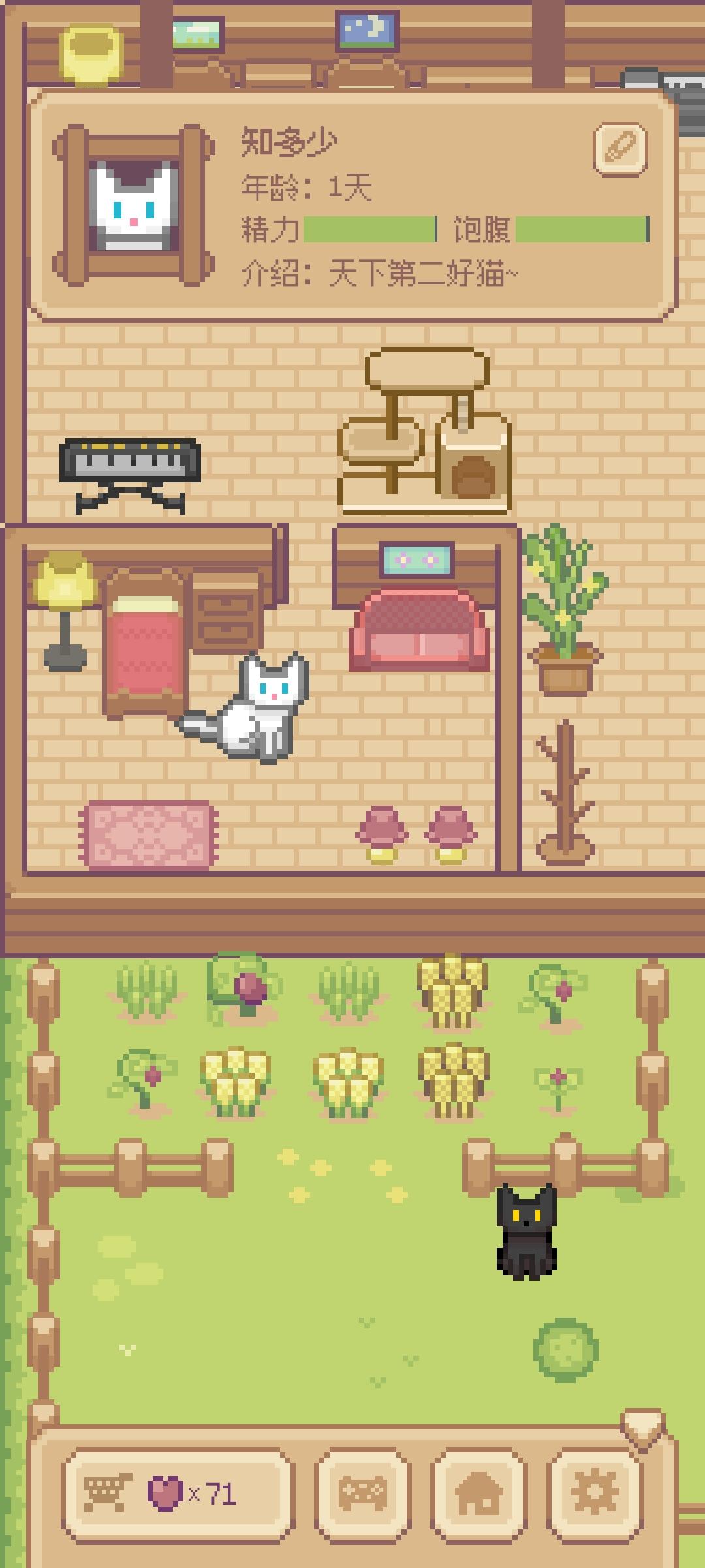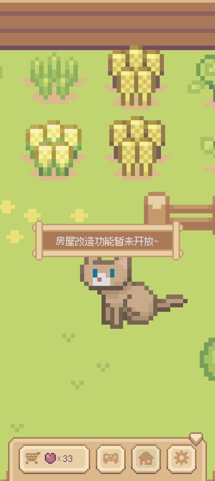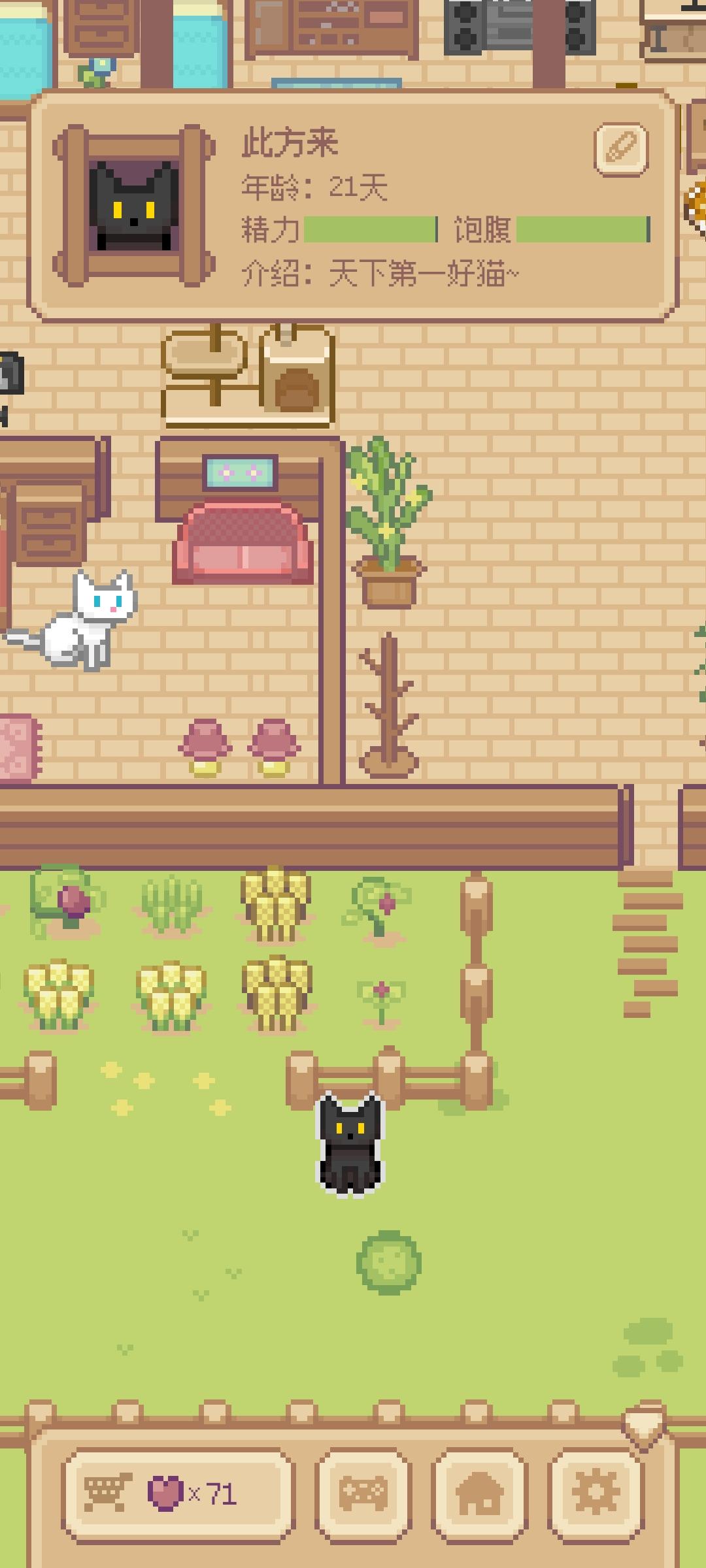 希望猫碗能在商店中购买,猫粮(更高级因为想让猫咪吃的更好)在商店上架。还有菜园的菜能种和吃/拔,(给猫咪吃)最好弄个菜谱。这个猫爬架没用,猫咪既不在上面玩又不在上面巡视(睡觉)。最后房屋改造功能啥时候开放😭