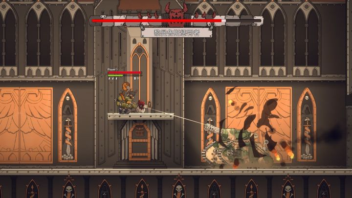 游戏的单人闯关剧情可以自选难度,个人觉得选最简单的就好,原因只有一个字——爽。最简单的难度有很多的血包和存档点,不用担心会有受挫感。游戏的操作和主流的横版动作游戏一样,上手几乎没什么门槛,初始的武器也十分好用。射击时注意子弹数量,以及在敌人来袭时及时跳跃躲闪,对付成群的敌人善用手榴弹,基本上简单难度打小怪的时候就不会死,重头戏在BOSS战。BOSS之前的战斗我们主要的任务是注意收集场景中的蛮牙。这个蛮牙是非常重要的资源,可以解锁武器和帽子,这是本作收集玩法的重要内容。