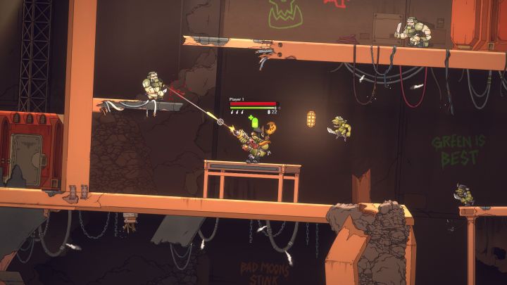 《Warhammer 40,000: Shootas, Blood & Teef》是一款以“战锤40K”为IP的2D跑酷射击平台游戏。玩家扮演的主角是一个英勇善战的绿皮兽人战士,擅长使用各种枪械。我们将用自己的枪与人类帝国的大军作战,还要向夺走自己漂亮头发的兽人战争头目欧格鲁克·骨崔卡复仇。不过,剧情什么的不重要,在跑酷中射爆敌人才是最重要的事。