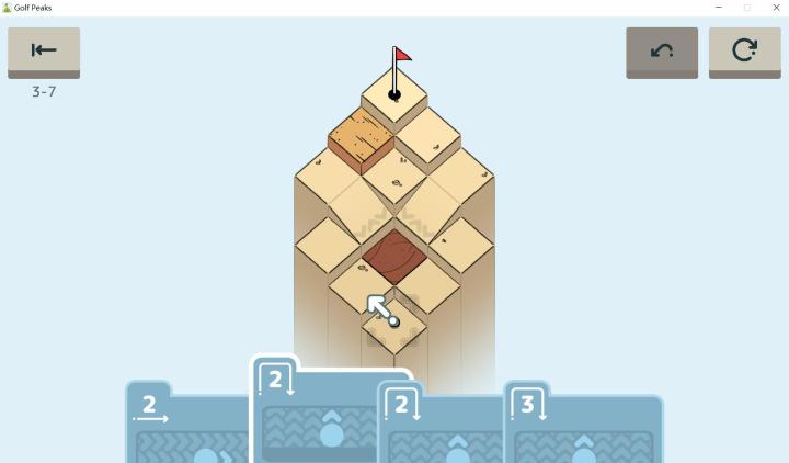 玩家每关不需要将卡牌全部用完,只需要将球送入球洞即可过关。当然,球移动的距离必须不多不少正正好,才能准确的入洞。玩家可以通过一些小技巧,比如反弹,来对移动距离进行调整,以达到刚好入洞的效果。因此,合理利用卡牌以及操作技巧,是过关的关键。球的移动方向由玩家来控制,与卡牌无关。