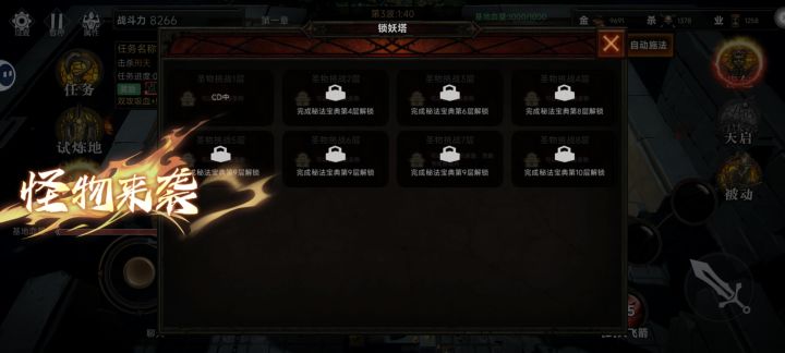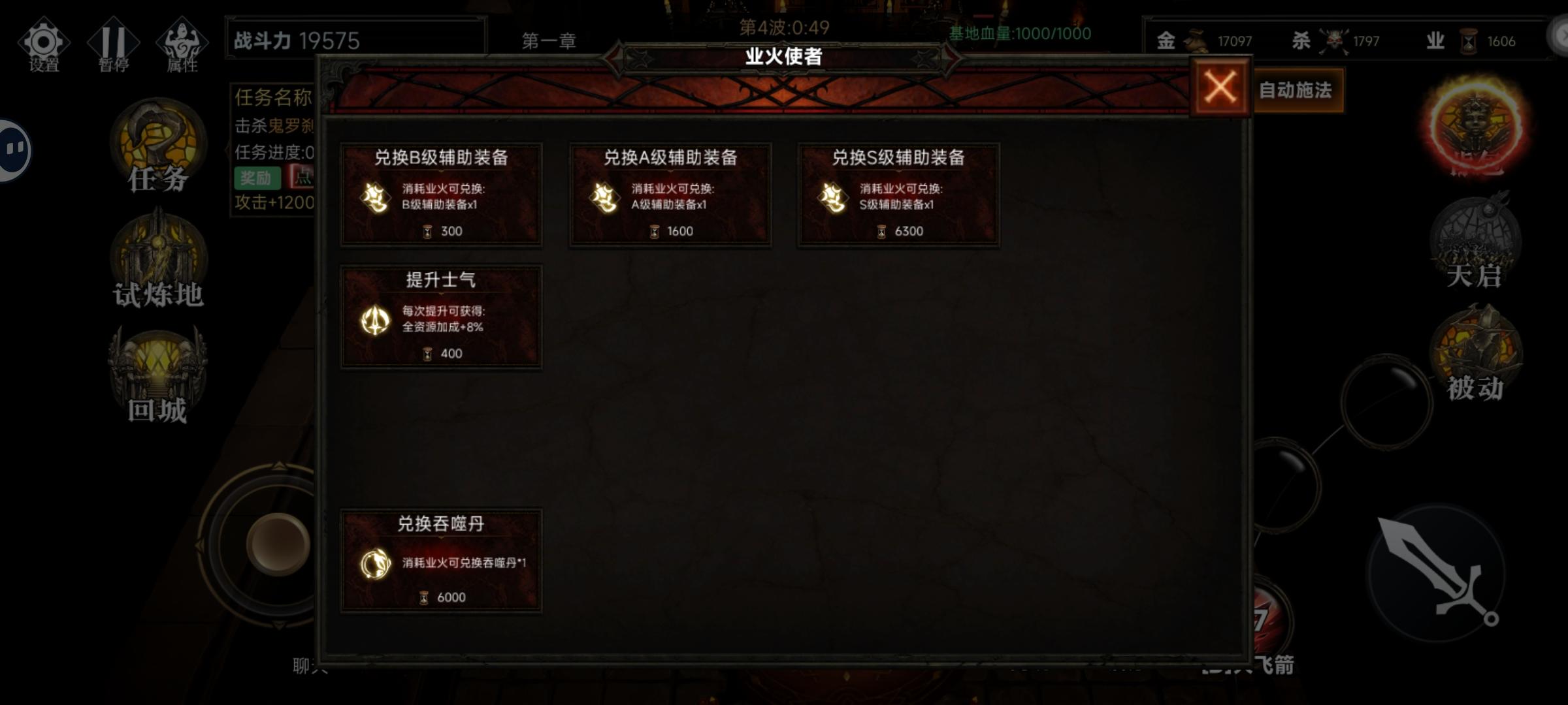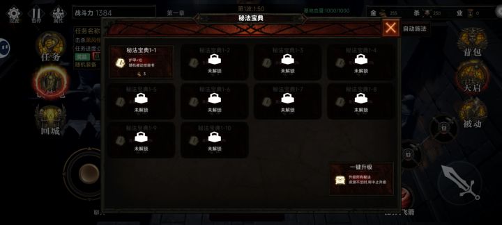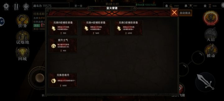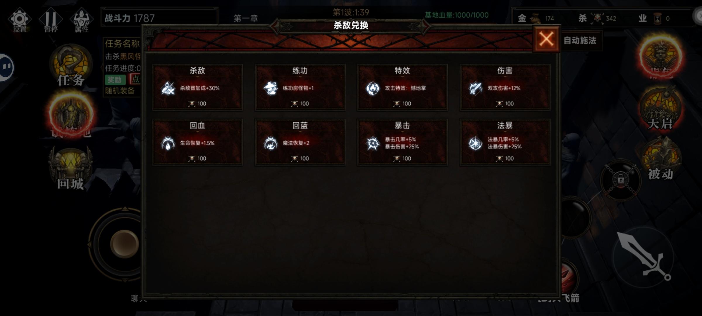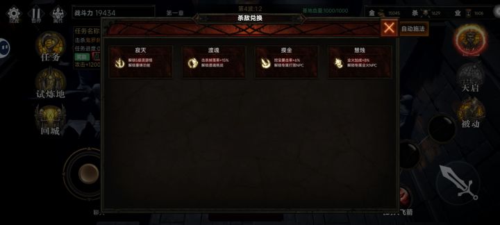 首先我们进入游戏后后有3种模式。正常模式,挑战模式。钓鱼模式。一般我们先进正常模式。挑战模式可以等前三章装备全满后玩。钓鱼模式可以没空玩的时候挂自动钓鱼,鱼也是给属性的 进入正常模式,选择难度和角色。进入后点击练功房。我们先刷金币。刷金币的同时可以点击上面任务一起做。金币够了后。点击天书。一键升满。挑战boss。会多出一个新的杀敌兑换,把里面都兑换完。可以看下上面图片。兑换完会出现4种职业。萌新