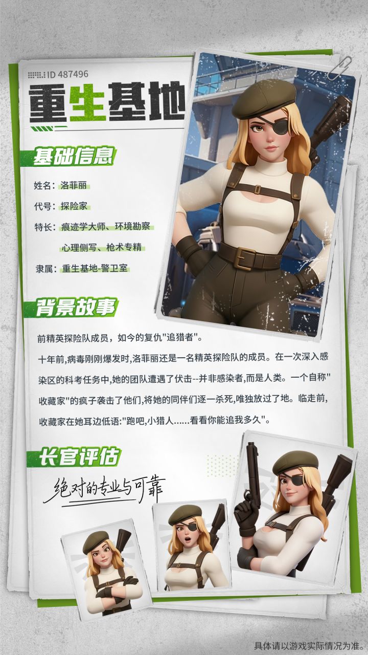 "他们绝无逃脱的可能!"_______________________________________长官,向您介绍你的得力助手——洛菲丽,前精英探险队成员,未来在重生基地内常驻,负责基地内安全保障工作。🎁有奖互动:长官,在末日到来后,您认为什么样的助手可以帮助您保卫基地,是洞察一切的侦察兵,独当一面的战士,还是算无遗策的大脑,或是......在评论区中分享您对理想助手的描述,lotor