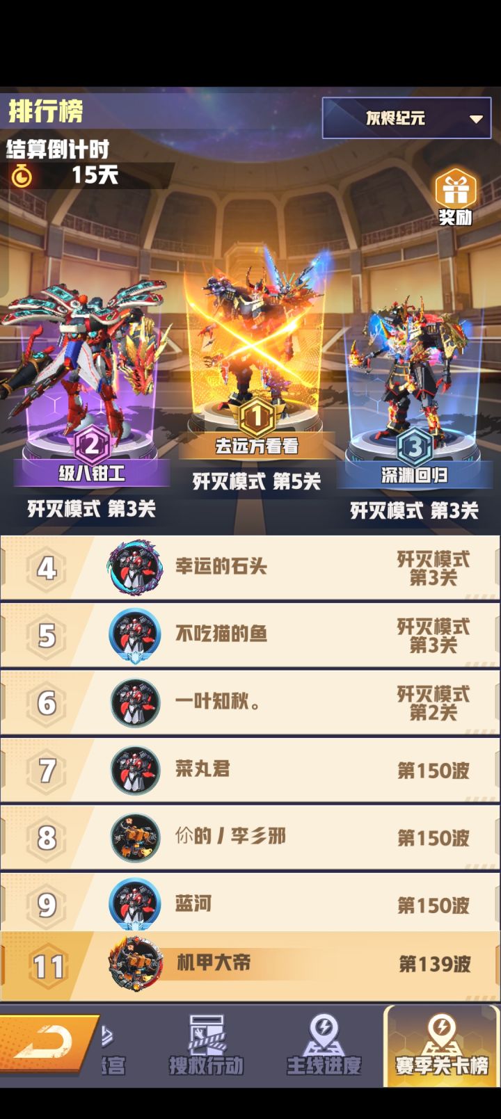 外围养成集中在机甲页签内,总计16台机甲,品级最高S,有蓝紫金红的品级设定。单个机甲的武器特点鲜明,可以升级、升阶和更换皮肤。