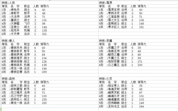 先写了兵种名称 人数 种族 领导力其他的等以后吧