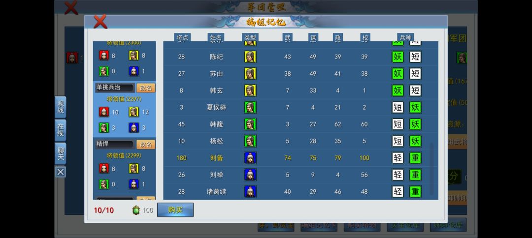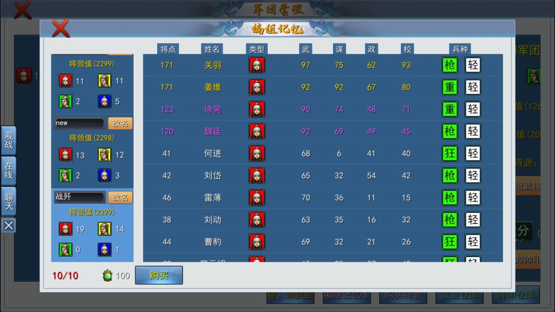 新手配将 无帅印的标准配将为:10-10-2-3 买将按照以8金配将来买,8金配将指的是:4金武4金谋1金校(不包括金狂战,4金谋中长弓不应超过2个),8金配将可以应用所有帅印的配将,其他根据个人爱好,随意 新手五不碰:野战、郡治、久战、政守、想当后勤玩的兵治(该游戏后勤难度极高) 新手优先买将,值得买的高性价比将有: 金:除了狂战的所有武谋,刘备、张角、甄宓(这三个金校有一即可) 紫:郭嘉、吕蒙