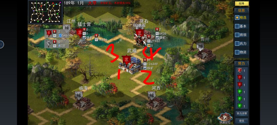写个夹高级经验,夹主要是知道打匪的屁股。一队匪过来怎么知道正好夹屁股。面对自己算1右面算2作面算3上面算4。电脑将领过多会按1234顺序补齐4面。这样把主力放在后面可以快速夹没敌人。有人听懂的就加个图吧。(1)视野盲区,怎么判断电脑打野城,一键小队攻打野城,行军轨迹差一格就说明有电脑在打野城不可以夹他。(2)如何让电脑快速打过野城进入夹击圈。可以开始就派辅助将拉出200,想让他过来直接直接带将上几十兵让对面过来。也可以不带将,2000以上兵撞城。系统判断物资加兵总和2000以上就可以运输。利用这点可以灵活拿城。(3)后期如何快速抢城:派2将精兵民兵各几十进行抢城。判断是否是电脑造兵点,点右上角将领看见有将要夹城抢城。
