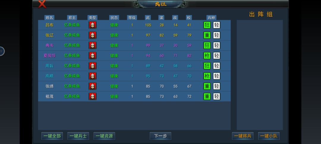 武将: 张辽、赵云、庞德、关羽、甘宁、姜维 金武将中的长枪、重步武将数据高,战损好,是任何配将必带的将领。新手没必要追求关羽姜维这种高数据强将,随便凑4个金武将就有很强的战力了。 不要买任何狂战!像吕布、张飞等,他们的数据低,战损差,只能在剿匪模式中爽,打玩家不要带。有人说,狂战带金学识不就行了,经过测试,其实即使是金学识,选4个狂战也和常规配将相比低了10%战损。而金学识这种灵宝新手根本搞不到,