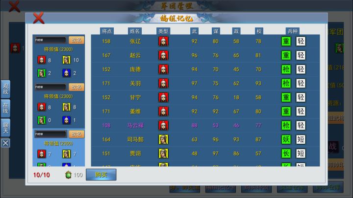 新手配将无帅印的标准配将为:10-10-2-3买将按照以8金配将来买,8金配将指的是:4金武4金谋1金校(不包括金狂战,4金谋中长弓不应超过2个),8金配将可以应用所有帅印的配将,其他根据个人爱好,随意新手五不碰:野战、郡治、久战、政守、想当后勤玩的兵治(该游戏后勤难度极高)新手优先买将,值得买的高性价比将有:金:除了狂战的所有武谋,刘备、张角、甄宓(这三个金校有一即可)紫:郭嘉、吕蒙