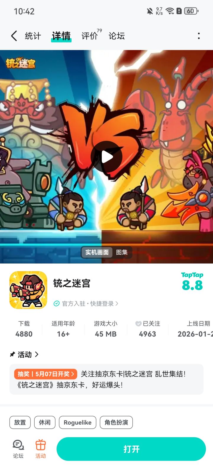三国猛男们,集合了!村庄被毁,黑暗势力要灭世——关羽扛起双枪,张飞架起连弩,诸葛亮掏出神秘铳械……这不是你听过的三国,这是 《铳之迷宫》 !🔥 超爽打击感 + 阵容自由搭配🔥 武将技能相辅相成,轻松打出飘逸连招🔥 走位风骚,可攻可守,萌新也能秀翻天🎁 福利时间随机抽取1位幸运的主公,送出【京东卡】一张!📅 活动时间即日起 —— 2026年5月7日 23:59✍️ 参与方式(超