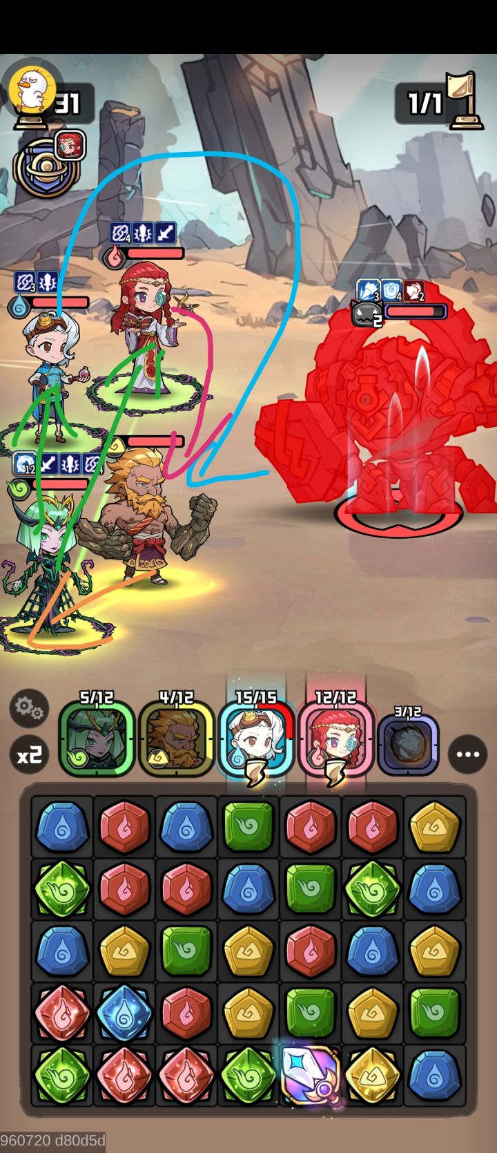 如图箭头所示,齐→菲雅,菲雅链接其他两个,阿琳娜主动技给齐。普洛斯星纹技随机给buff加能量。完美内循环。只要启动boss醒都醒不来。还能解放老虎等其他神话英雄。前期开荒十分好用。就是对菲雅星级要求高,至少6星,7星最好。