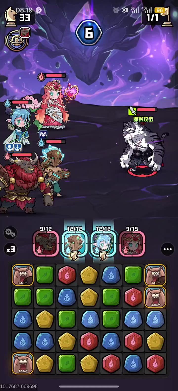 这个boss的机制,你打他越痛,他打你就越痛,boss能量条满了就是丢炸弹(群体AOE伤害),没满之前都是丢小炸弹(单体伤害)。 以光国队演示 我们开局就是刷大宝剑开局,这样方便拿高分,开局消点绿色尽快把菲亚能量攒齐,链接牛牛和老虎,同时攒能量过程中。看一看,赌一赌大宝剑(赌不到也没办法,多打几次,看运气) 控制好回合数,大概剩余10-15回合之内开始总攻击,开局你需要做的就是菲亚链接牛牛老虎,绿