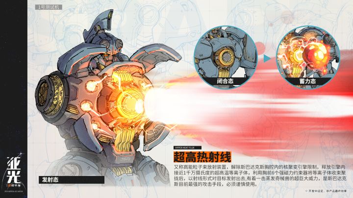 正式名称为高能粒子束放射装置。解除斯巴达克斯胸腔内的核聚变引擎限制,释放引擎内接近1千万摄氏度的超高温等离子体,利用胸前6个强磁力约束器将等离子体收束聚拢后,再以射线形式对目标发射出去,有着一击蒸发奇械兽的超巨大威力,是斯巴达克斯目前最强的攻击手段,使用时必须非常谨慎。#亚光 #国模 #机甲 #机战 #战棋游戏