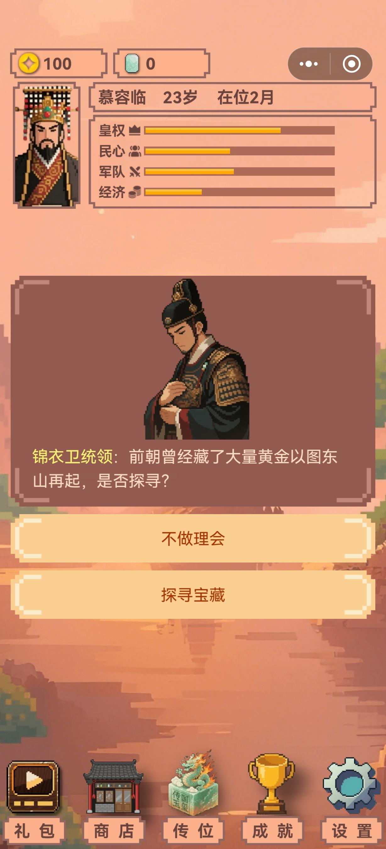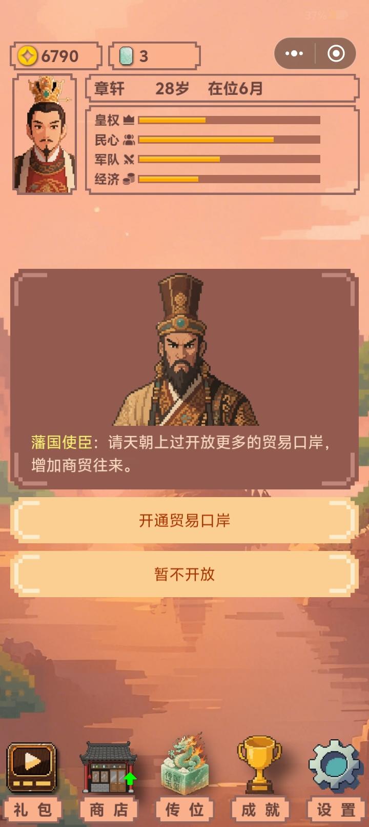 · 在面对事件时,若选项能稳定或提升皇权,即使会轻微损失经济、军队或民心,在初期也应果断选择。例如,面对贪官,选择“严厉查处”(+皇权,-经济/民心)而非“姑息纵容”(+经济,-皇权)。