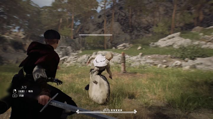 比如普通手持一个单手武器的小兵,只要长按右键双手持武器进攻,一般在第二下就可以破韧,随后在补上1~2刀就能解决掉。如果目标手持大型、重型甚至是盾牌,削韧就变的非常的重要了。同时敌我双方都有体力条限制,体力条低于20%会有一个非常明显修西硬直的时间,而且在攻击的先后手上,如果是我方先手,敌人必定能成功防御,对我方的体力控制来说可以是致命的,毕竟在设定上,主角还是个小孩子。