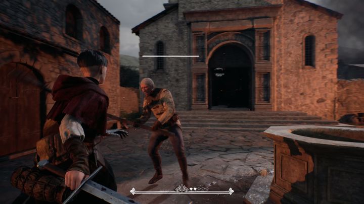 游戏的动作战斗系统相对来说槽点较少,但也比较单调没什么创意,但和上面的重量级问题相比可以夸赞一句战斗系统短小精悍了。玩家的攻击方式分为左键的单手攻击连招和按住右键持剑双手攻击,升级可以提升连招次数和解锁重攻击。但抽象的也在这里,双手攻击的起手动作非常之短,在连招的时候很容易造成第一击未命中,起手攻击长的反而是单手攻击。最鸡肋的是重攻击,玩家除了在正式拼刀之前提前蓄力的一发重攻击之外,在战斗相持阶段发出的几乎全部重攻击都会被读指令闪避,有那么多点数去升级重攻击还不如全部点属性,对比之下,闪避回血的天赋技能简直是制作组的怜悯。本作拥有类似于只狼中的架势条设定,游戏中玩家击杀敌人需要先清空对面的架势条,对方会进入破防状态,这时玩家才可以真正伤害到他的血量,那么机制讲完了,玩家实战阶段会碰到什么情况呢?因为有单手和双手两种攻击方式,玩家如果一直使用一种会遇到强弹刀,直接把你连招打断不让你打,玩家需要切换攻击方式才行,逼得你不得不双修攻击方式。你学会了灵活切换攻击方式还不够,游戏中的索敌系统会让你再吃一壶,玩家战斗时的锁定视角不能根据自身需求进行自由切换,而是自动切换,一进战就锁定,且只会锁定当前攻击你的敌人,这就导致你打老半天快要打空架势条的当前敌人,因为其他小兵的围殴被强行切换视角不得不去打另一个人让那个本来空了架势条的敌人得到了喘息之机,你以为这样就完了?制作组显然是知道这个机制的,故意恶心玩家,因为在最后两章玩家不能退款之后,制作组彻底放飞自我开始堆怪,这堆怪还不是普通的堆怪,一次给你出个俩到三只怪,然后等你打到只剩一只的时候再给你补两只,如此循环两三次你才能清完一个小场景,简直逆天!