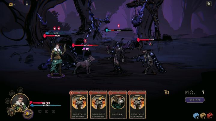 本作的战斗和其他的肉鸽卡牌一样,卡牌上有行动点数、效果、伤害这些,初期人物角色只有3个行动点数。初始的角色虽然伤害一般,但带了一条狗,狗能吸引大部分的伤害,死了还能复活(春哥祝福),所以一些防御卡牌给主角本人用就行了。角色还有技能,每轮的战斗有使用限制。
