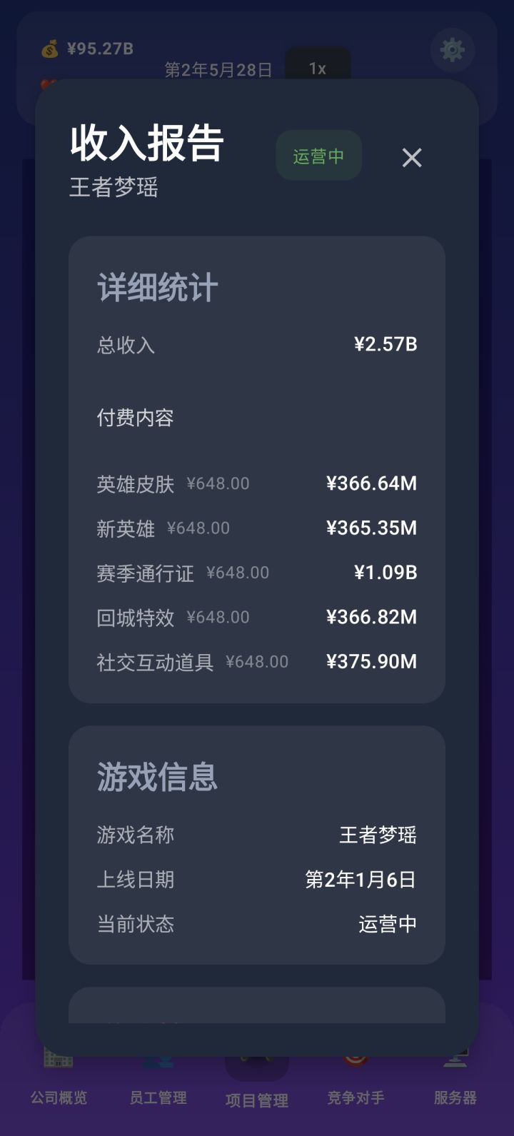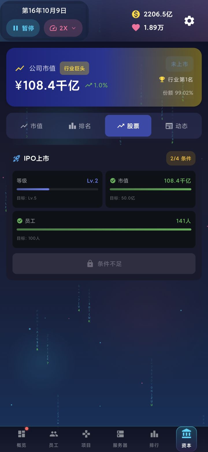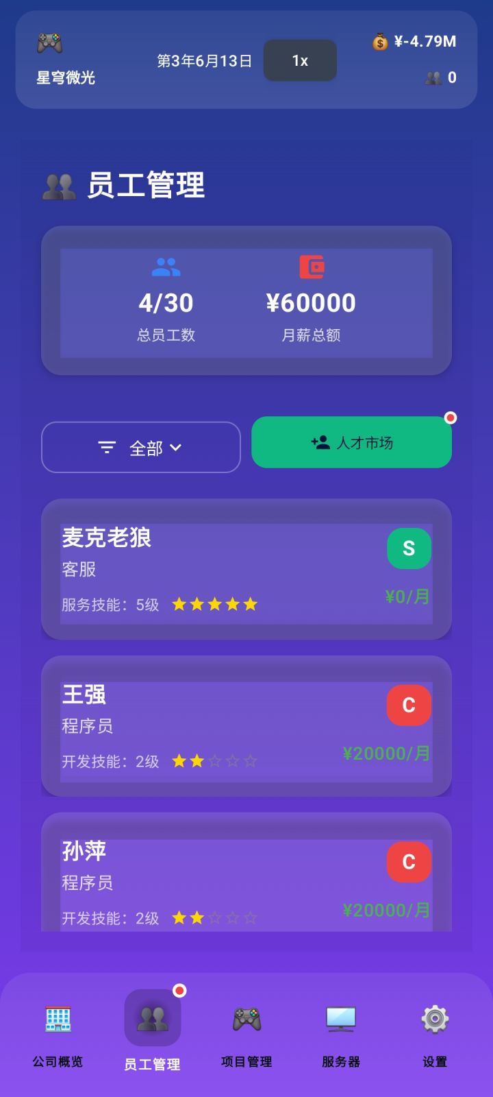 没有数值类养成,员工等级在招聘的时候可以自定义,高级员工月薪更高,运营压力更大。游戏上线或发售可以自定义售价,对于收益会有一些影响,但并不清晰。