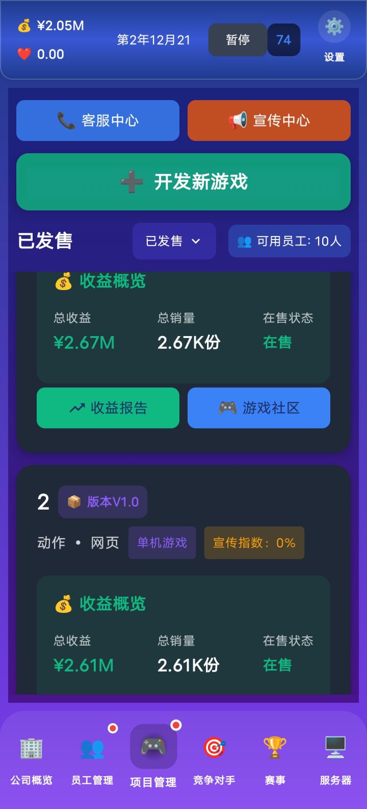 开局先把三个任务完成,给的公司经验很重要。客服招三个,其他岗位招满,只要三千块工资以下的。然后无脑刷手机单机,项目满导致不能研发就下架最早的腾位置继续研发。员工等级上来后游戏越做越快,盈利越来越多。凑够500万卡传奇(提前存档,没招出传奇就读档重新来),传奇能让评分提升很大,挣钱能力提高。凑够4个评分提到中档。4个传奇就是完整版,然后有钱就培训员工,普通员工最高天赋能到50,培训满后三天一款游