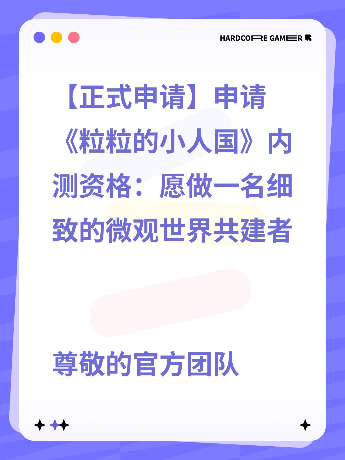 【正式申请】申请《粒粒的小人国》内测资格:愿做一名细致的微观世界共建者 尊敬的官方团队: 我预约游戏很久,游戏首曝以来便持续关注的玩家。《粒粒的小人国》以其独特的“皮克斯绘本风”美术和“微观视角探索日常”的创意,深深吸引了我。每次看到新内容发布,都让我对这个温暖、治愈的微小世界更加向往。 我为何如此期待并想参与测试? 因为我不仅是被游戏吸引,更是被其背后的理念打动: 1. 视觉与情感的治