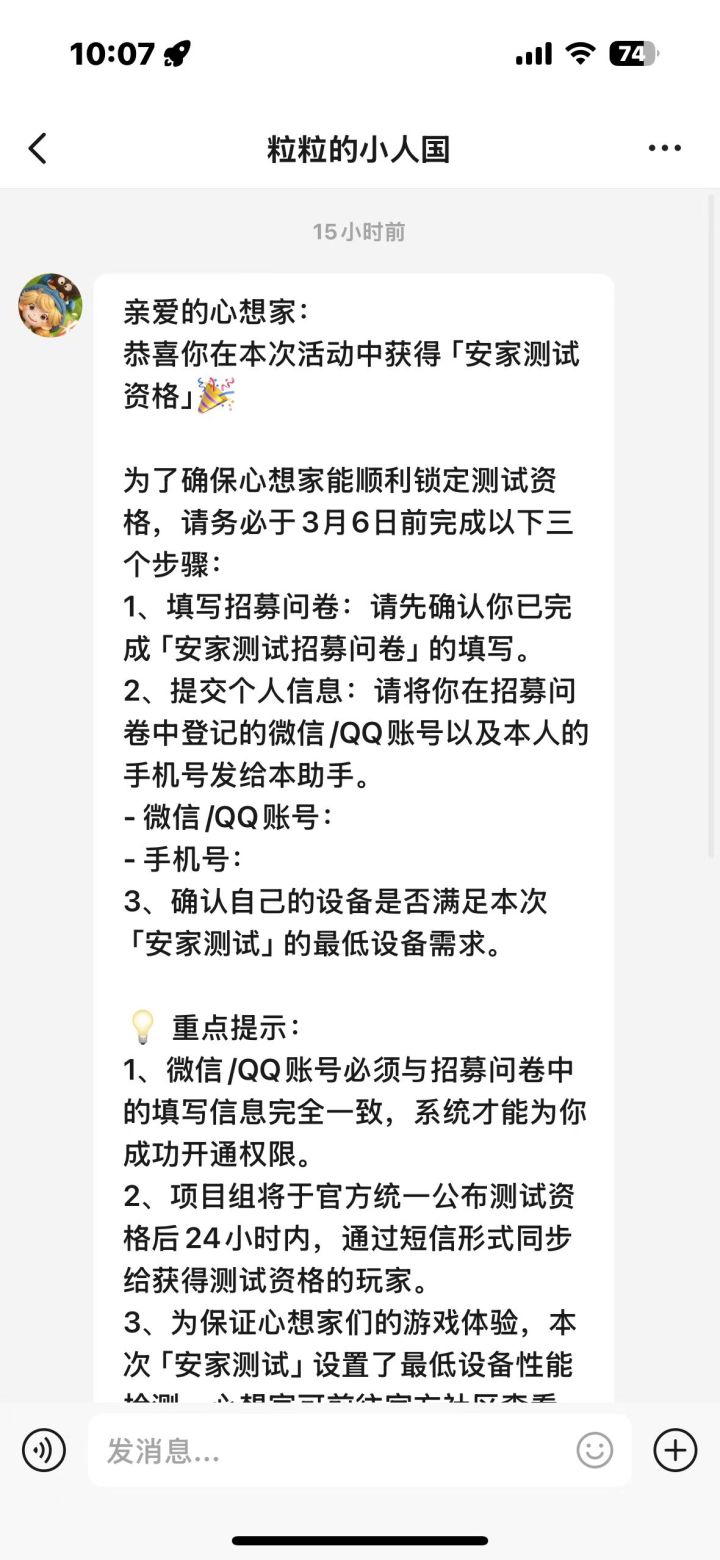 【正式申请】申请《粒粒的小人国》内测资格:愿做一名细致的微观世界共建者 尊敬的官方团队: 我是一名自2月1日游戏爆出后 便持续关注的玩家。《粒粒的小人国》以其独特的“皮克斯绘本风”美术和“微观视角探索日常”的创意,深深吸引了我。每次看到新内容发布,都让我对这个温暖、治愈的微小世界更加向往。 我为何如此期待并想参与测试? 因为我不仅是被游戏吸引,更是被其背后的理念打动: 1. 视觉与情感