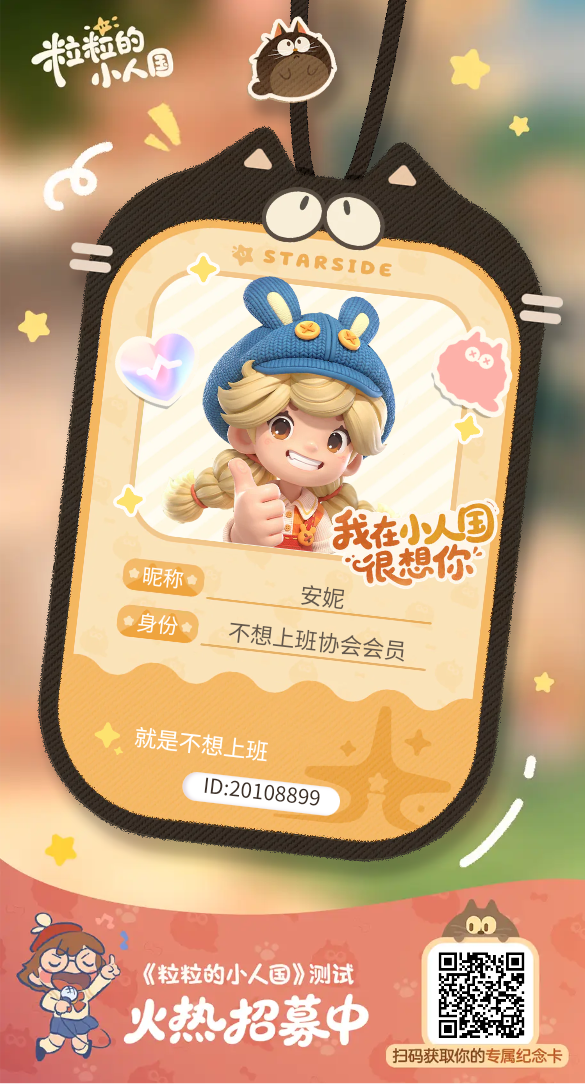 《粒粒的小人国》安家测试招募正式开启!心想家们都前往报名了嘛~ 🌟 测试招募报名通道点击链接: 滴栗会认真整理每一份入住申请✨好奇这一次,心想家会是什么身份?快来晒出你的专属纪念卡,和大家分享吧! 🌟 活动时间即日起 - 2026年2月27日 🌟 活动规则完成测试招募活动,并在评论区分享心想家的专属纪念卡~滴栗将为10位心想家锁定「安家测试资格」、并送出粒粒的小人国PU徽章1