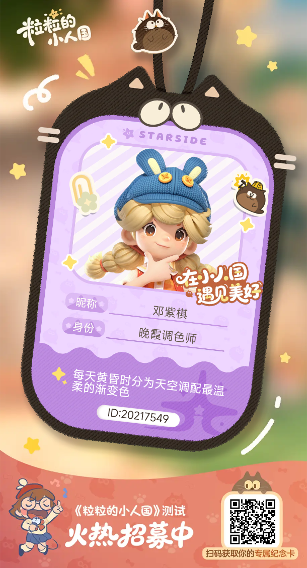 尊敬的《粒粒小人国》运营与开发团队:您好!我怀着无比期待与喜爱的心情,郑重申请本次粒粒小人国内测资格。从第一次看到游戏的治愈画风、微观世界设定与温馨的小人生活玩法开始,我就被这款作品深深吸引,一直持续关注官方动态,每天都在期待能够早日进入这个可爱又治愈的小人世界,亲身参与建造、探索与陪伴。 我非常喜欢模拟经营、休闲养成、自由布置类游戏,平时也乐于体验各类治愈系作品,对画面细节、交互手感、任务