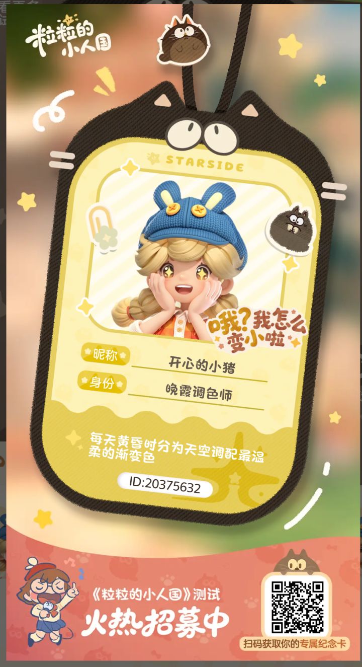 【正式申请】申请《粒粒的小人国》内测资格 #粒粒的小人国 我是一个渺小的普通玩家!抽到这个角色卡超级开心,有感觉被认真的对待!从游戏宣发开始,就被可爱的画风角色吸引,迫不及待到里面看看属于自己的人物造型还有房屋装修!我特别喜欢小人国温馨的氛围,回到游戏像回到属于自己的小小世界!“咦?我怎么变小了!” #粒粒的小人国内测名额 #粒粒的小人国怎么还不上线