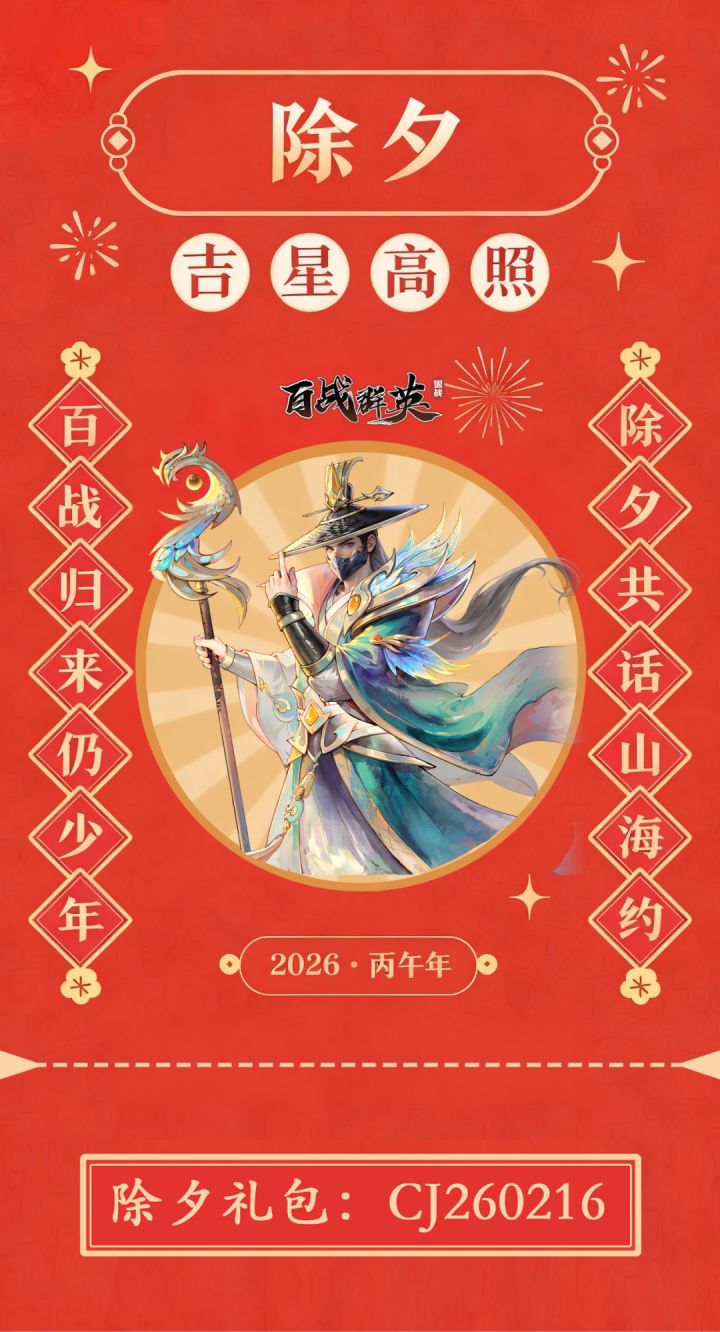 除夕夜,一起清零烦恼,加载快乐!愿主公们来年暴富、暴美、暴开心!为诸位准备了除夕福利,新年buff已就位,速领!礼包码:CJ260216复制上方礼包码进入游戏兑换,福利即刻到账礼包有效期至2月28日所有礼包仅限《百战群英》官方平台玩家使用,非平台玩家无法使用,敬请谅解。同类型礼包同个角色仅限使用一次,重复领取无效。