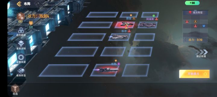 印象中似乎看过一次,纯数值卡牌战斗,无需手动操作,过程没什么看点,支持加速和跳过功能,后者需要VIP或视频解锁,氪金点很明确。布阵阶段支持15个位置,上阵有cost限制,在战舰数量多的时候有一定组合搭配空间,但仍然以战力为导向。