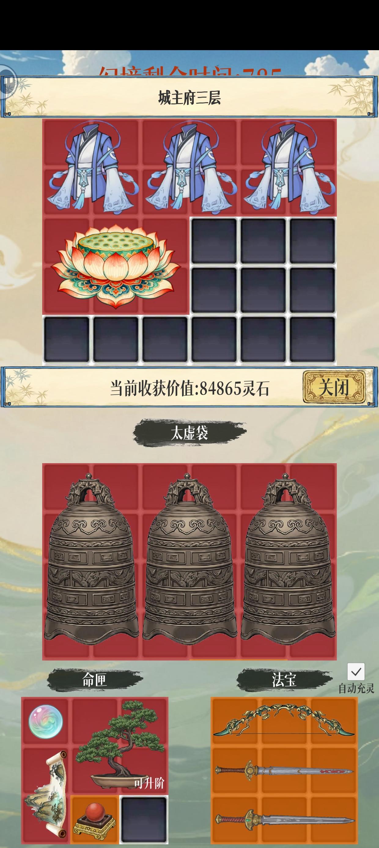 此世刚解锁无底渊就不自量力去挑战天骄了,结果也显而易见,进图1900+的异常命中根本挂不上禁绝和中毒,就连最简单的饕餮都打不过,只能退而求其次打挑战,好在挑战难度还是比较容易的,打BOSS掉了虚无归源诀(好像是混沌掉的),这功法附加属性是异常命中,功法本身也是攻略BOSS的神器,再加上化神灵宝刷了几条异常命中的词条,进图2300+,有法宝增加异常命中后可以稳定挂禁绝,之后就是简单的挂机了。PS: