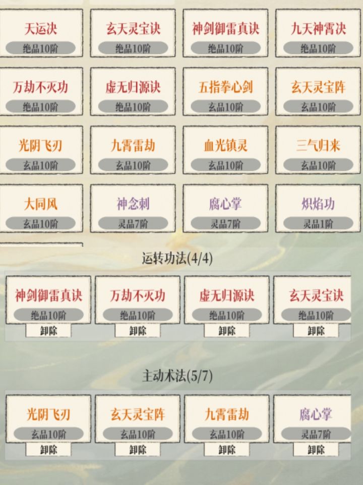 虚无归元还是太超标了。核心虚无归元(功法)+腐心掌(术法)+毒瓶(法宝)出伤。神剑御雷(功法)+九霄雷劫(术法)+光阴飞刃抢条。玄天灵宝决(功法)+玄天灵宝阵(术法)增加法宝频率。