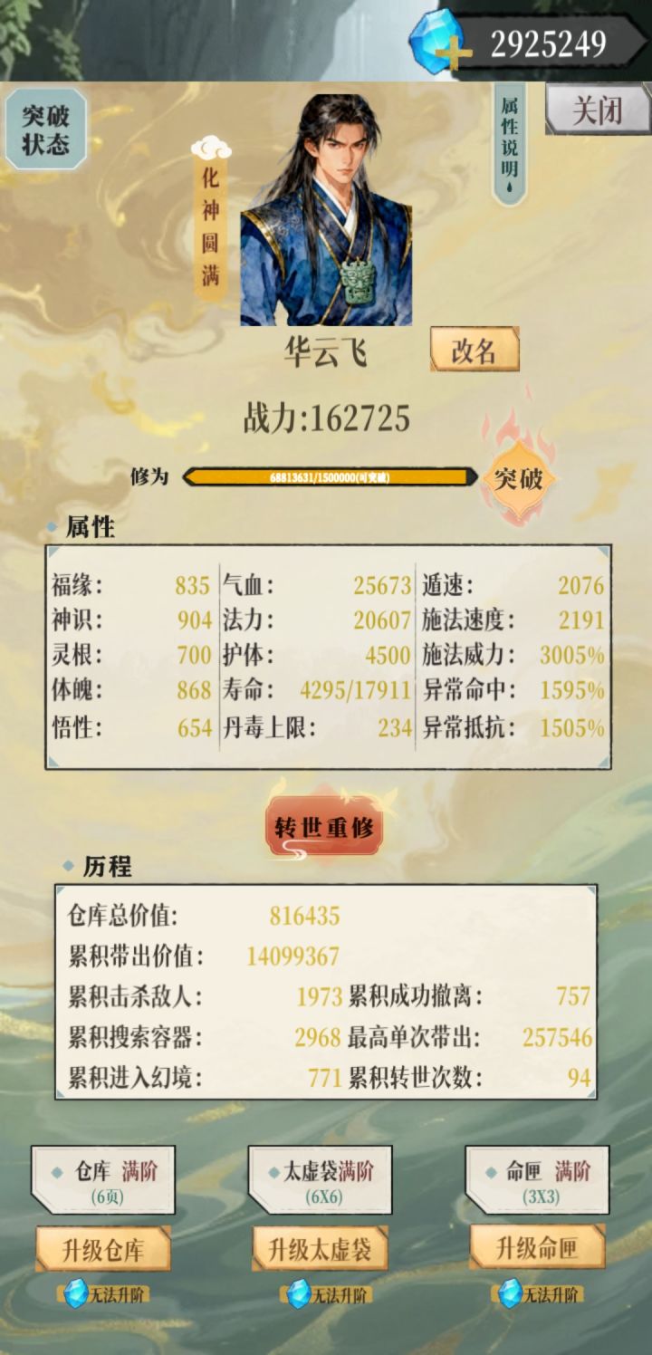 还有一个没截图,前中期有点肝,还有好多寿元丹没吃,寿命用不完根本用不完