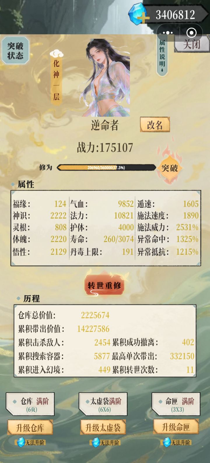 虚无,饥饿,滋养,中毒,这套带化灵三弓,只要能稳定上异常,再拉点遁速(遁速不够打不中,没饥饿,封禁跟不上腐心掌),可以五只2分钟内过。玄武15秒内,饕餮20秒内,其他三个20秒多个一点点。属性是天命点全200突破至化神5层,经验不够,全藏品5星。实测法宝不用堆属性也能挂异常。第三个还能换火球术。唯一的问题是混沌概率翻车。没有先手权避免不了。