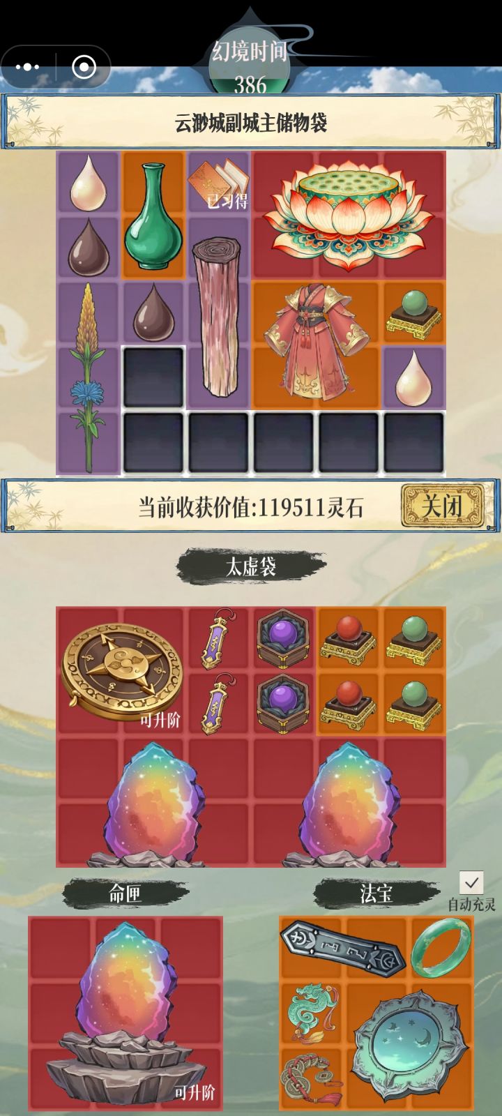 刷刷新技能需谨慎,耗费天命值很多。幻物分真不是很实用,但是可以在练气图刷补天石很快。灵囊藏物必选。灵寻多获必选。幻物归藏必选。