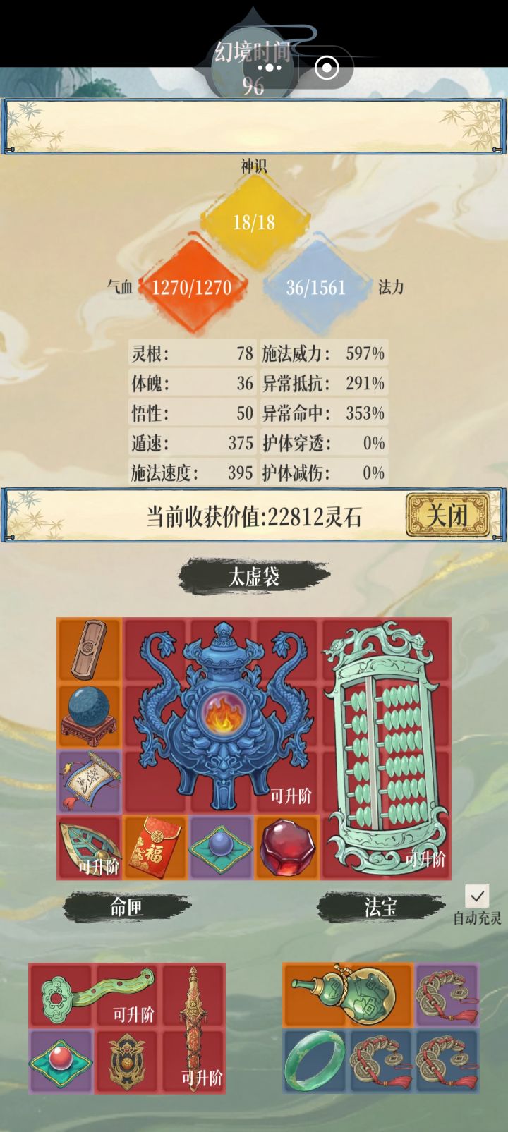 筑基卡金丹刷钱中,看到拍卖会有功法居然能加福源就买本浅浅练了下。平时一次有一道三个红就顶天了,练了这本功法之后的第一把出三个算盘,太离谱了!