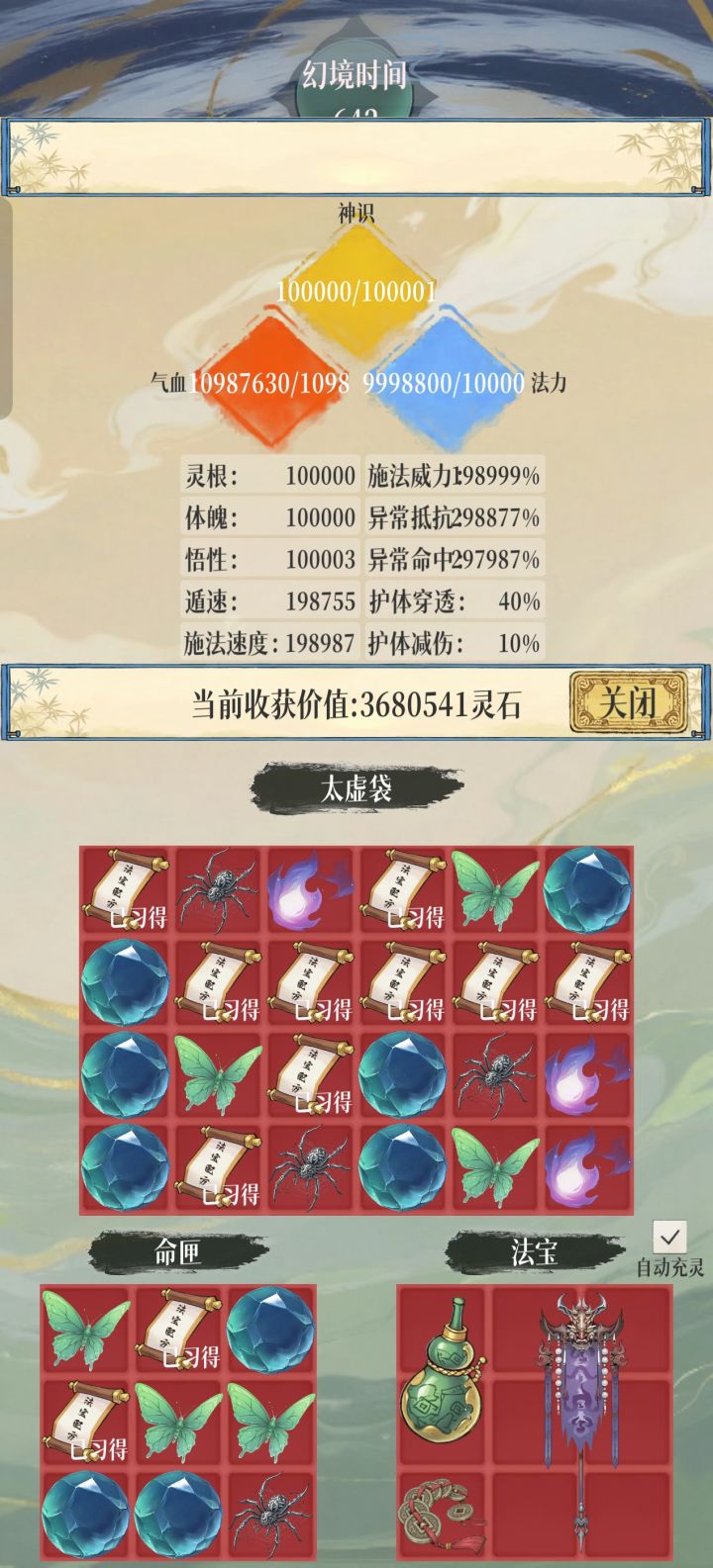 罗盘爆率太低了,直接带一个进图,用灵宠的那个复制能力暴力拉满第二个藏品页,直接成仙,大约花了51个小时通关
