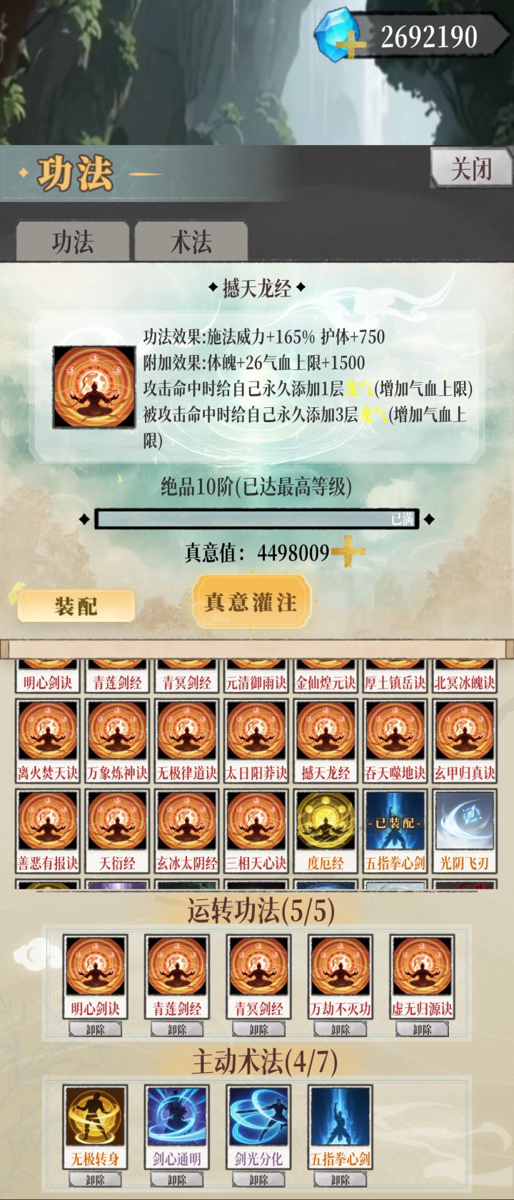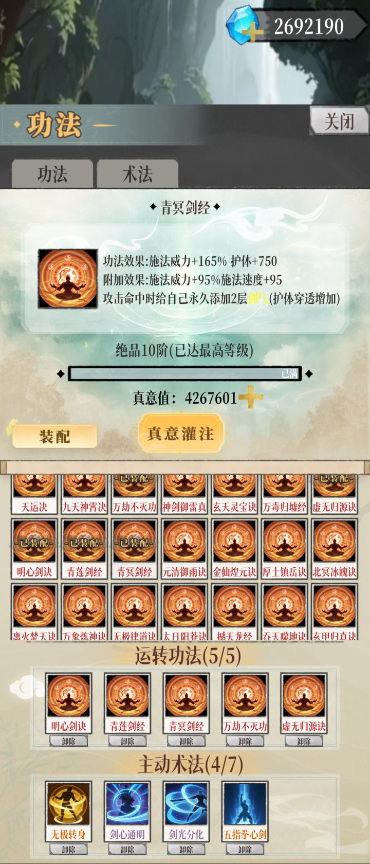( 主力输出由原先的橙色🟠术法【剑破天穹】换成了最新的化神法宝【诛仙剑阵】。【诛仙剑阵】在叠到100层剑气时,能造成49%无视体魄(气血减伤)和护体的气血上线,等同于真伤!49%的伤害可以防止部分敌人的半血被动。现在只要一味的叠剑气就可以快速解决任何怪物!(【诛仙剑阵】的图纸只能在天庭里打怪和搜资源点有概率掉落) 功法搭配上在原有基础上,突破洞虚期可再加一红色🔴功法【善恶有报决】可持续叠加剑气