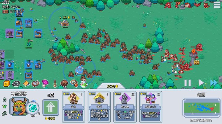 作为一款塔防游戏,玩法和其他的横板塔防游戏差不多,需要我们利用金币—建筑—士兵这个系统实现一定的循环,并且随着商店等级的提升,在原有布局的基础上将高级能替代的建筑进一步规划。比如谷仓的能力是使相邻的经济和文化建筑生产金币时额外+5%,上位的替代者是城镇中心,可以直接提高25%的百分比。