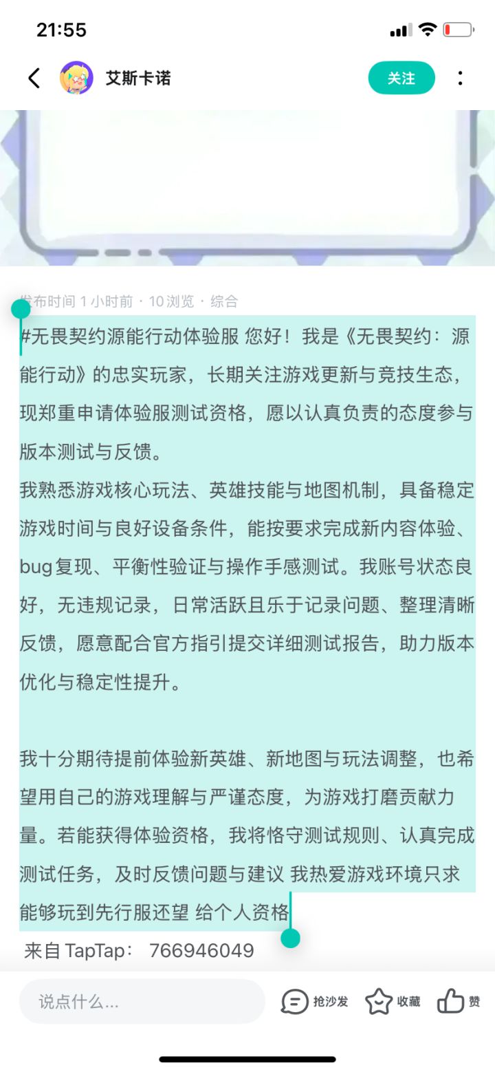 #无畏契约源能行动体验服 您好!我是《无畏契约:源能行动》的忠实玩家,长期关注游戏更新与竞技生态,现郑重申请体验服测试资格,愿以认真负责的态度参与版本测试与反馈。 我熟悉游戏核心玩法、英雄技能与地图机制,具备稳定游戏时间与良好设备条件,能按要求完成新内容体验、bug复现、平衡性验证与操作手感测试。我账号状态良好,无违规记录,日常活跃且乐于记录问题、整理清晰反馈,愿意配合官方指引提交详细测试报告,助力版本优化与稳定性提升。 我十分期待提前体验新英雄、新地图与玩法调整,也希望用自己的游戏理解与严谨态度,为游戏打磨贡献力量。若能获得体验资格,我将恪守测试规则、认真完成测试任务,及时反馈问题与建议 我热爱游戏环境只求能够玩到先行服还望给个人资格 来自TapTap【519271224】 来自TapTap[ID:519271224 佩奇]