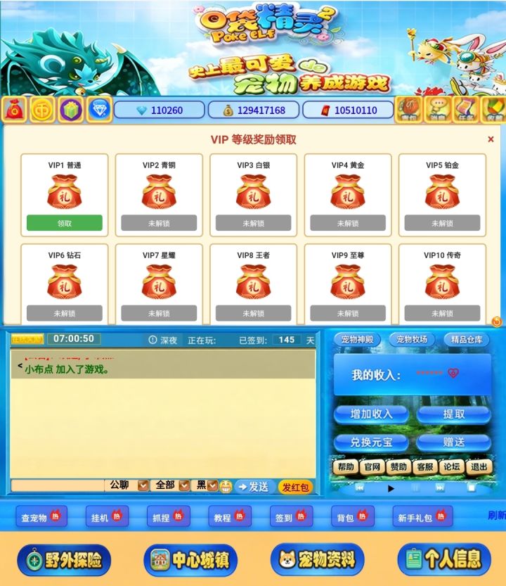 谁的童年没有《口袋精灵2》啊!看到这个界面直接DNA动了!当年蹲在电脑前刷野外、攒金币、冲VIP,为了抓一只稀有宠物熬到深夜,签到145天都是小意思!现在再看这个熟悉的蓝黄界面,满屏都是回不去的青春啊#童年回忆杀 #口袋精灵2 #页游怀旧
