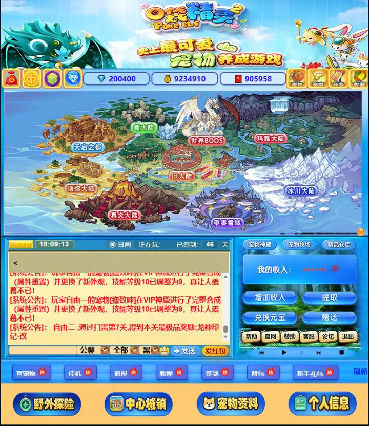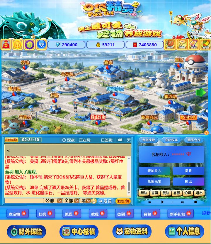 这是经典宠物养成游戏《口袋精灵2》的主城界面,炼金圣殿、宠物神殿、家族神殿等标志性场景错落分布,仿佛瞬间拉回当年的冒险时光。界面清晰展示了货币资源、系统公告与核心功能入口,“野外探险”“宠物资料”等按钮唤起熟悉的养成记忆,完美复刻了老玩家心中的经典游戏场景,满是怀旧与热血的精灵冒险氛围。