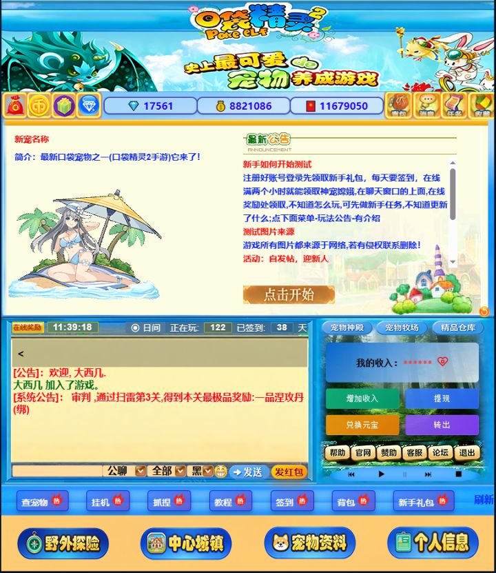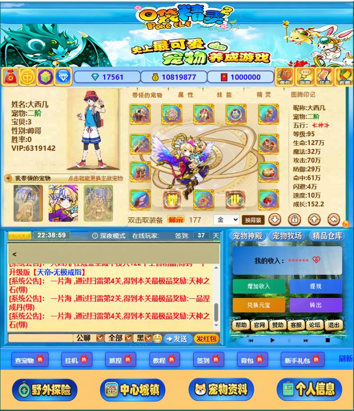 这是一张《口袋精灵2》怀旧重制版的游戏界面截图,完美复刻了当年的宠物养成玩法。画面中,玩家“大西几”的角色信息、VIP等级、钻石金币等资源一目了然,中间的宠物展示区里,一只华丽的二阶宠物“卡神ヤ”属性爆表,等级95、生命127万,搭配着满屏的极品装备和图腾印记,尽显大佬风范。下方的公聊频道滚动着系统公告,右侧的“我的收入”模块则融入了现代功能,让经典游戏焕发了新的生机。整体界面在保留复古画风的同时