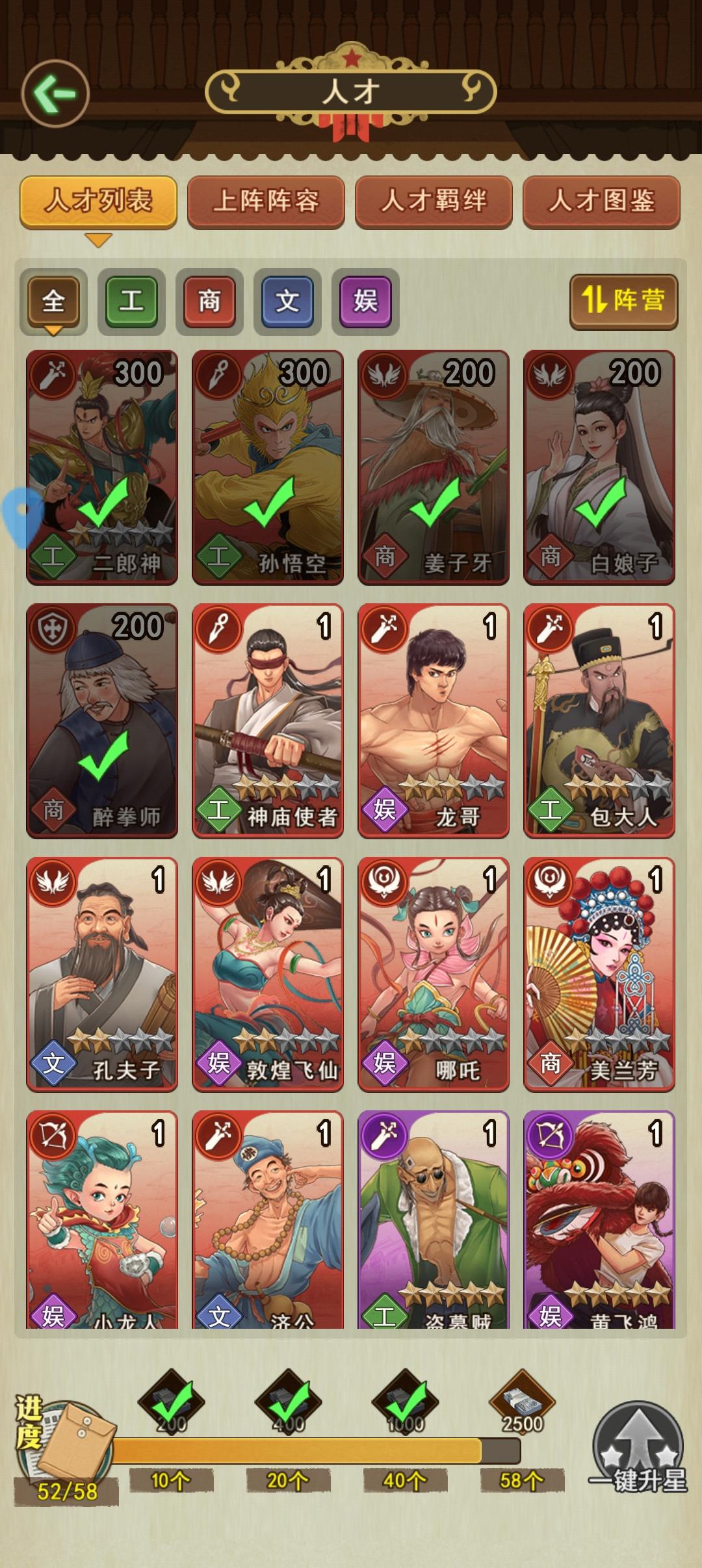 人才获取方法很简单,无论是兑换还是抽取,很容易全图,所以本攻略不分前后期,直接着重推荐几个人才。尽量自选碎片换这几个。白娘子,姜子牙,醉拳师,哪吒,二郎神醉拳师:肉辅,放第一位,开局给盾,如果没有换笑面虎。白娘子:后期如果能换四大天王,换魅力偶像,能跟白娘子的毒伤搭配打出伤害。哪吒:恢复生命+眩晕。姜子牙:增伤+控制。抽不出来,多参与活动,活动产出碎片能够兑换,充不充钱都能获得。姜子牙