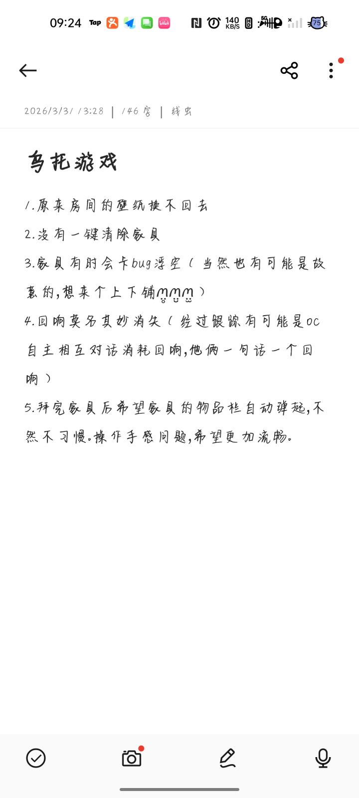 感谢您的反馈创世神。乌宝已经将您的需求都记录下来了,后续我们也会对目前的素材进行筛查,优化部分摆放操作不丝滑、图层有错误的问题。关于回响,有部分功能的改进内容已经提上日程了,感谢您的反馈。我们现在也在向创世神发起建议征集,也欢迎您这样资深的游戏爱好者填写问卷,并且如果您感兴趣的话,也可以选择与我们的策划老师1v1交流,再次感谢您的反馈!问卷传送门: